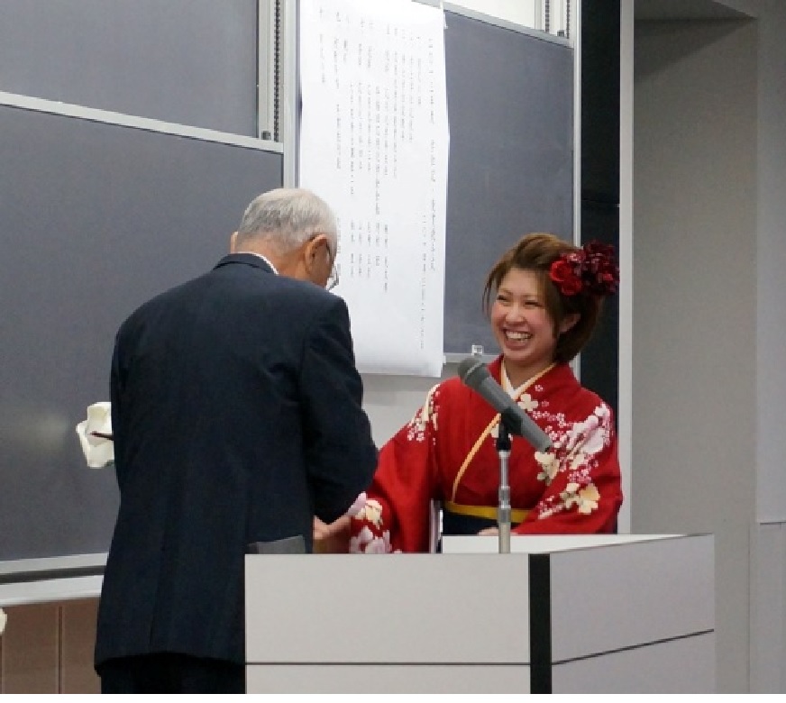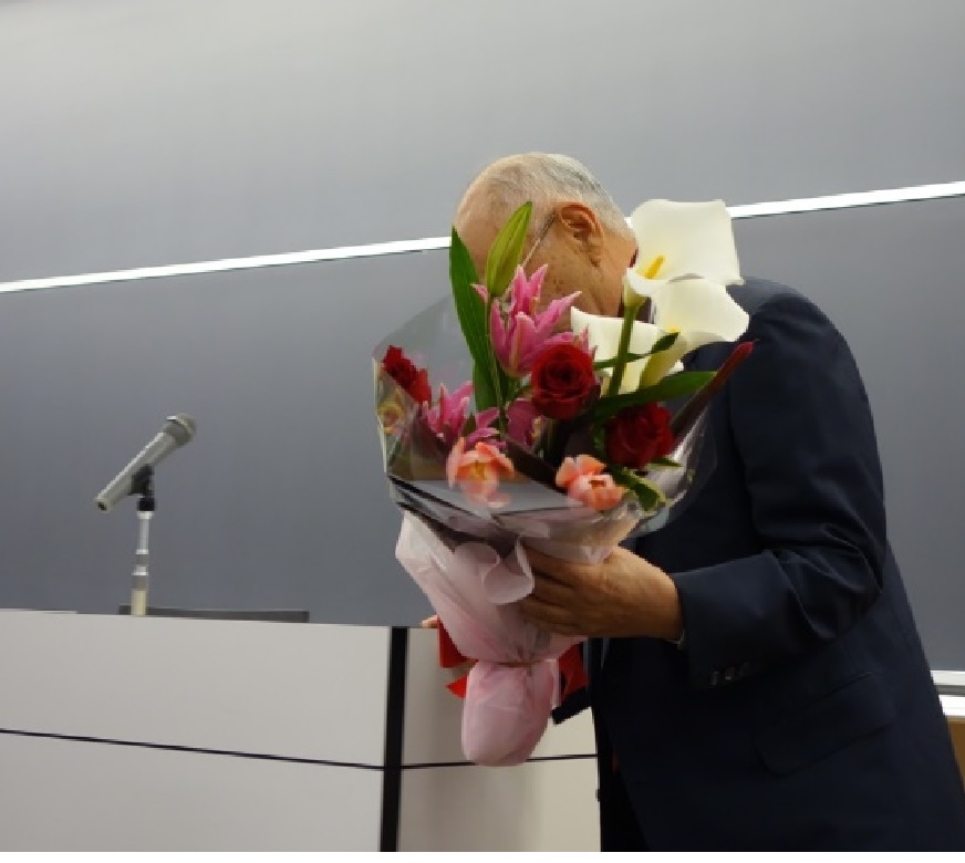 今年は、河村会長が本年5月に会長職を卒業されることから桐村主任教授の計らいで多くの学生が揃っている本日、これまでのご尽力に感謝を込めて学生全員が起立する中で、卒業生および修了生を代表して吉野友梨さんから花束贈呈の一幕がありました。