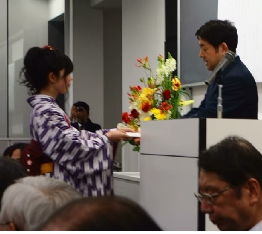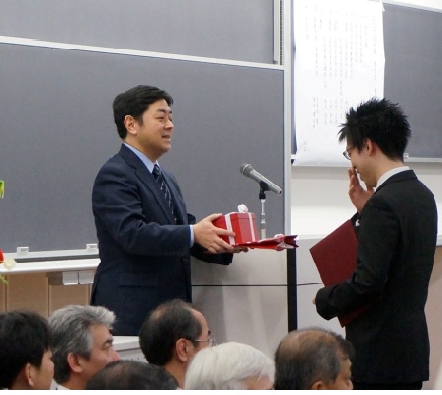 桐村 光太郎主任教授から以下の通り本賞設立の経緯、主旨等の説明があり、本賞および副賞が関根研究室の佐々木 悠介君に授与されました。