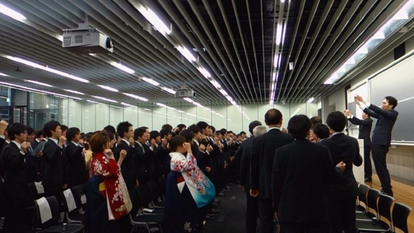 卒業生を代表して久保田 慧君および澤田 健太郎君のエールで式場は一気に盛り上がり、応援部員を彷彿とさせる大声による指揮により、全員での校歌を斉唱、「フレー、フレー早稲田」、「フレー、フレー応化」のエールでお開きとなった。