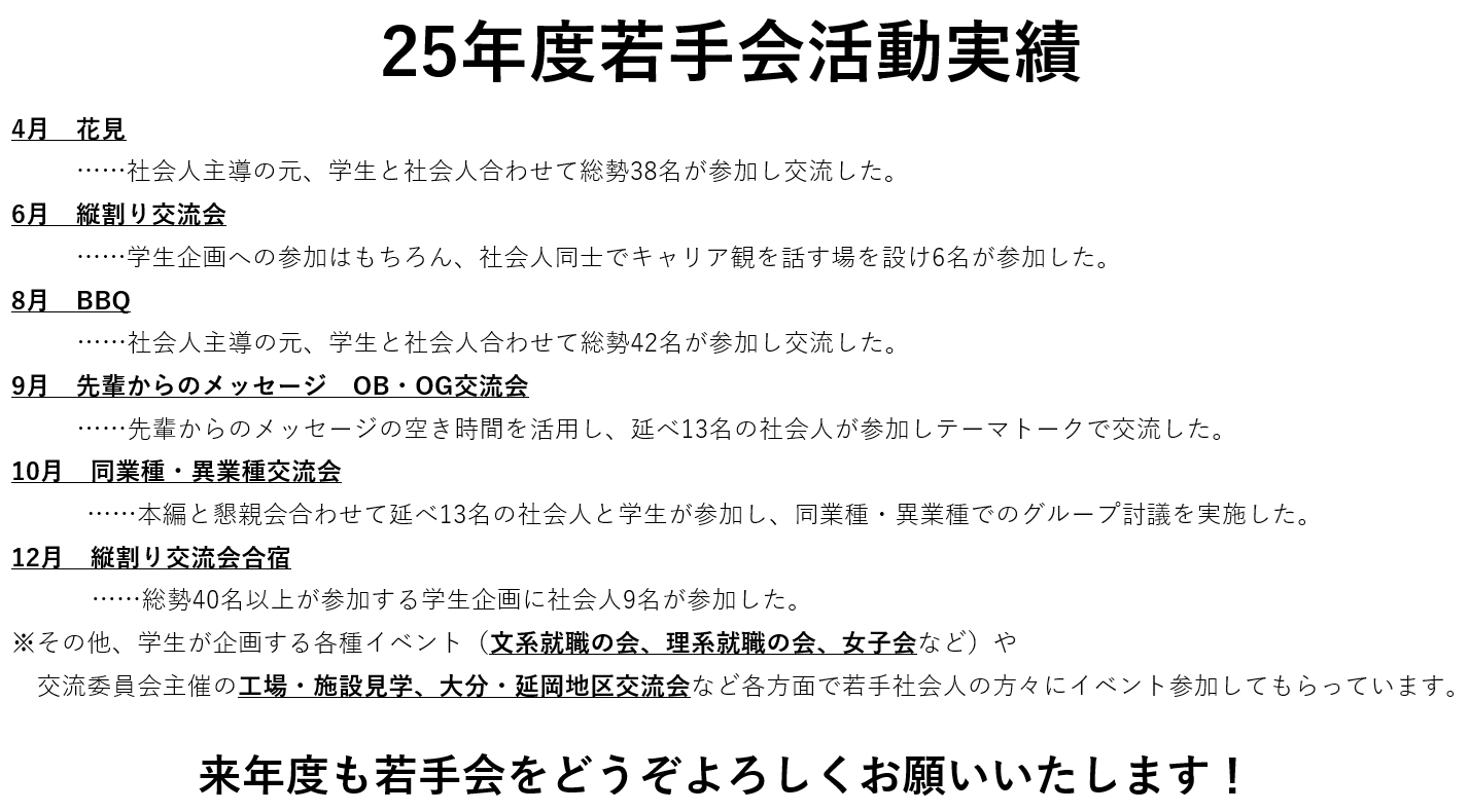 今年度の若手会の主な活動は全て予定を終えました。今年度の活動で得られたフィードバックを参考に、来年度も社会人向けの企画および学生と社会人の交流を目的とした企画をいずれも実施していきます。
