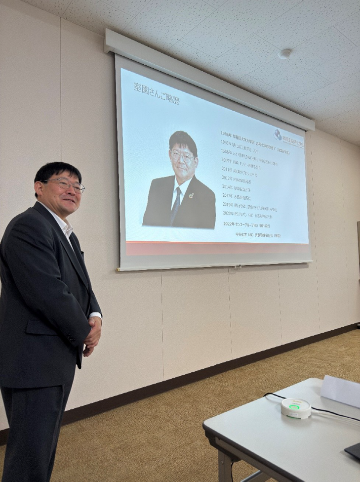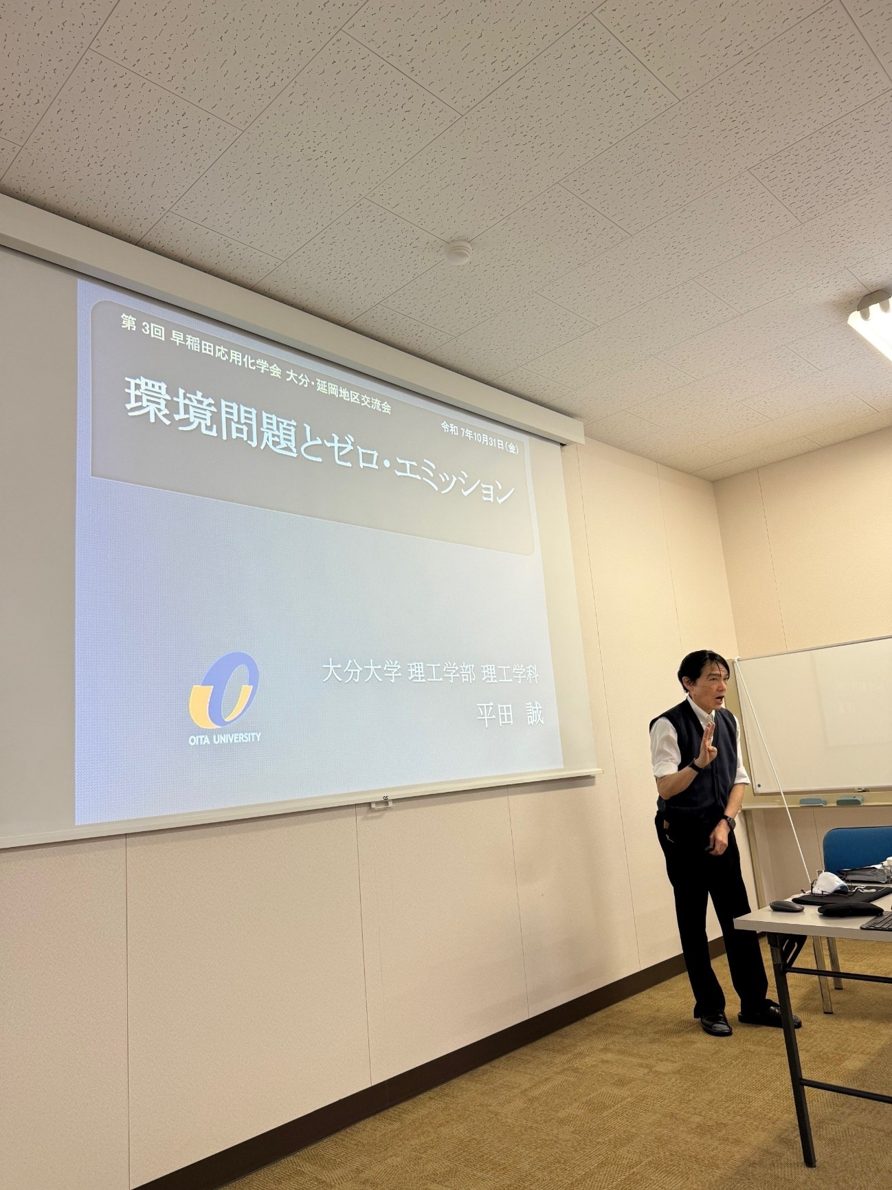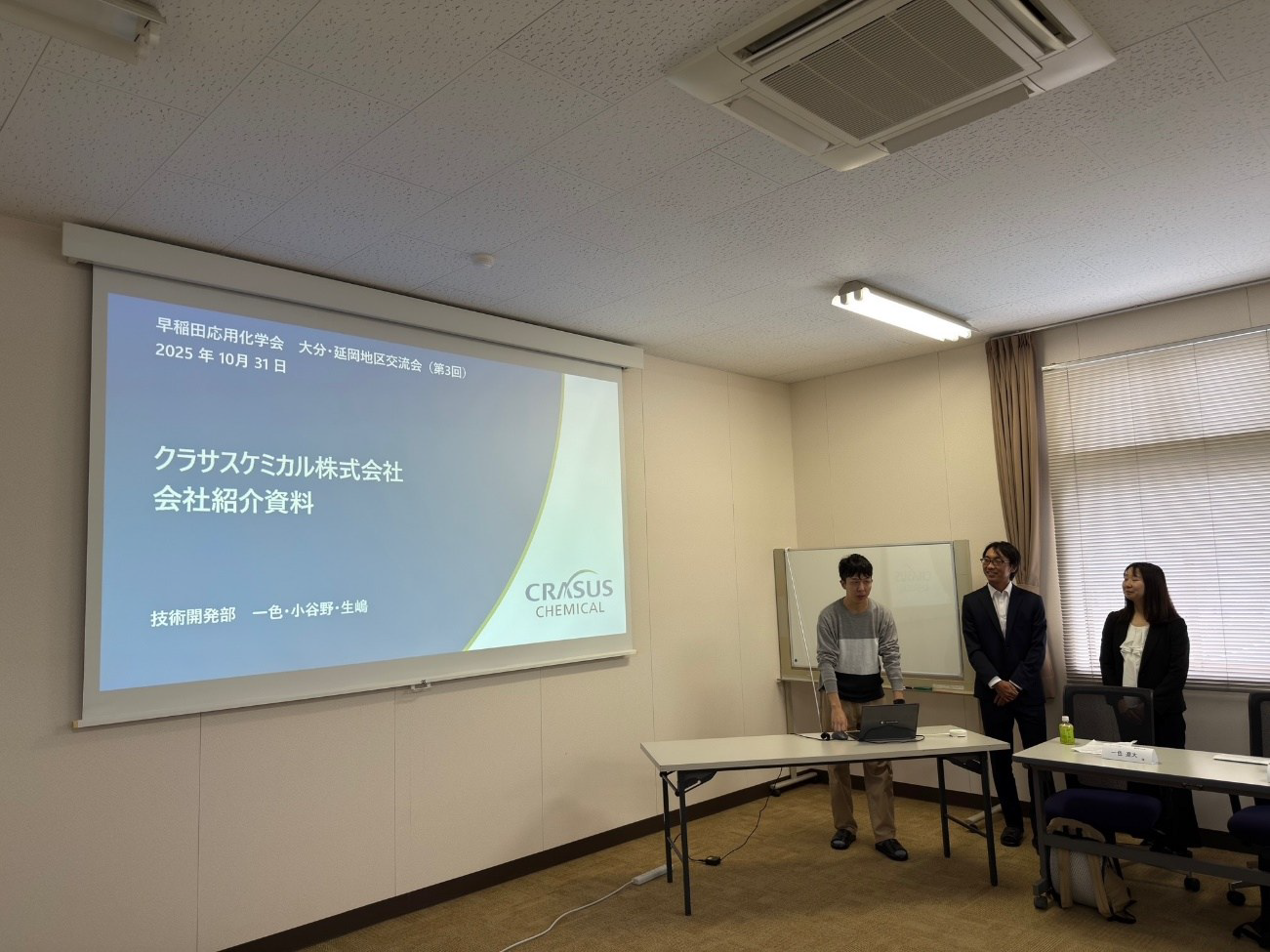 10月31日(金)第3回大分・延岡地区交流会を旭化成株式会社(延岡地区)にて開催いたしました。第1回から継続参加頂いている旭化成、ENEOS、クラサスケミカル(レゾナックより社名変更)の社員をはじめ、今年度から新たに住友化学が加わり、計4社に跨る繋がりを有す会となってまいりました。さらに、アカデミアから九州工業大学の中戸 晃之先生、大分大学の平田 誠先生がご参加頂いたことに加え、東京からのゲストとして下村 応化会会長、旭化成OBの室園様を含む、総勢18名での会となりました。