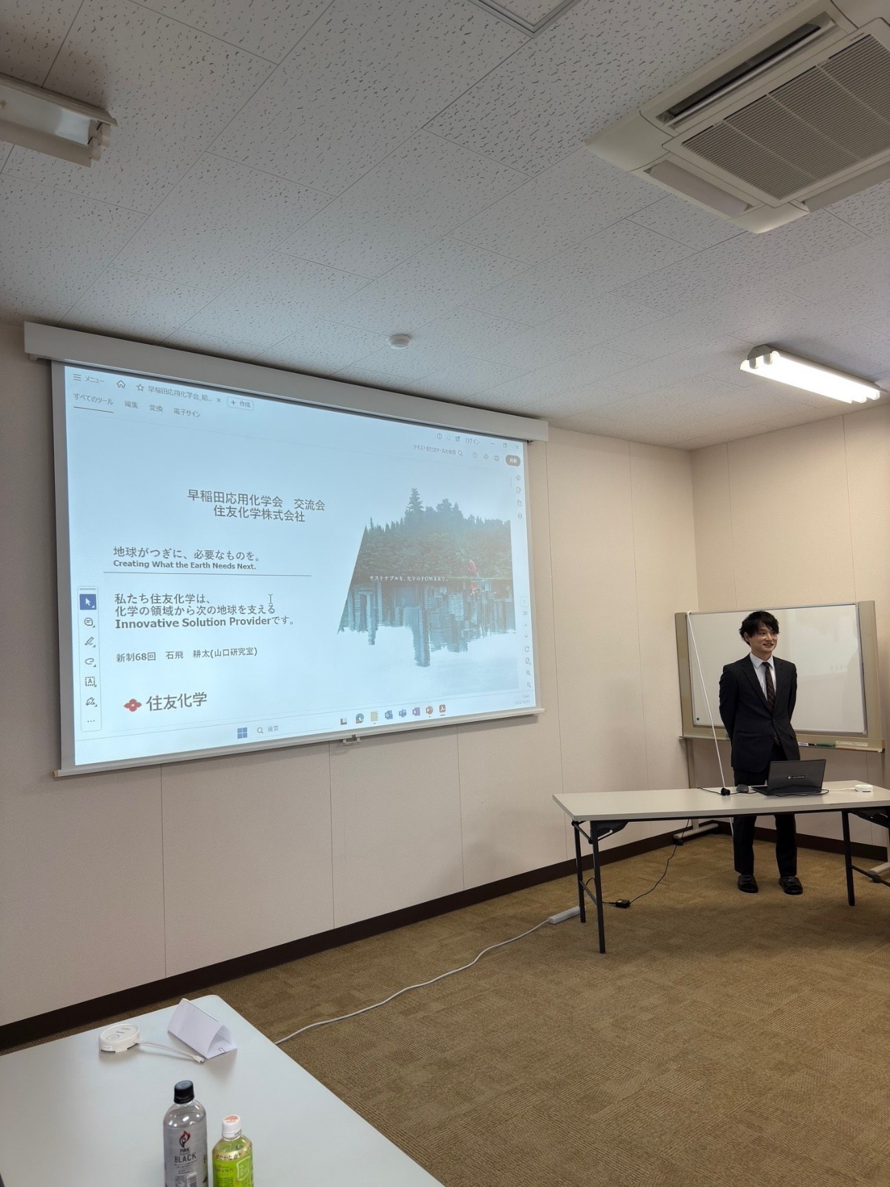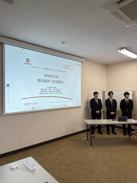 応用化学科を卒業し、理系職で働いているOB・OGの先輩方である髙田 こはるさん(菅原研、株式会社明治)、疋野 拓也さん(下嶋研、中央大学)、神守 広一郎さん(小柳津・須賀研、AGC株式会社)、尾﨑 正彦さん(菅原研、ENEOS株式会社)にお越しいただき、ご講演していただきました。