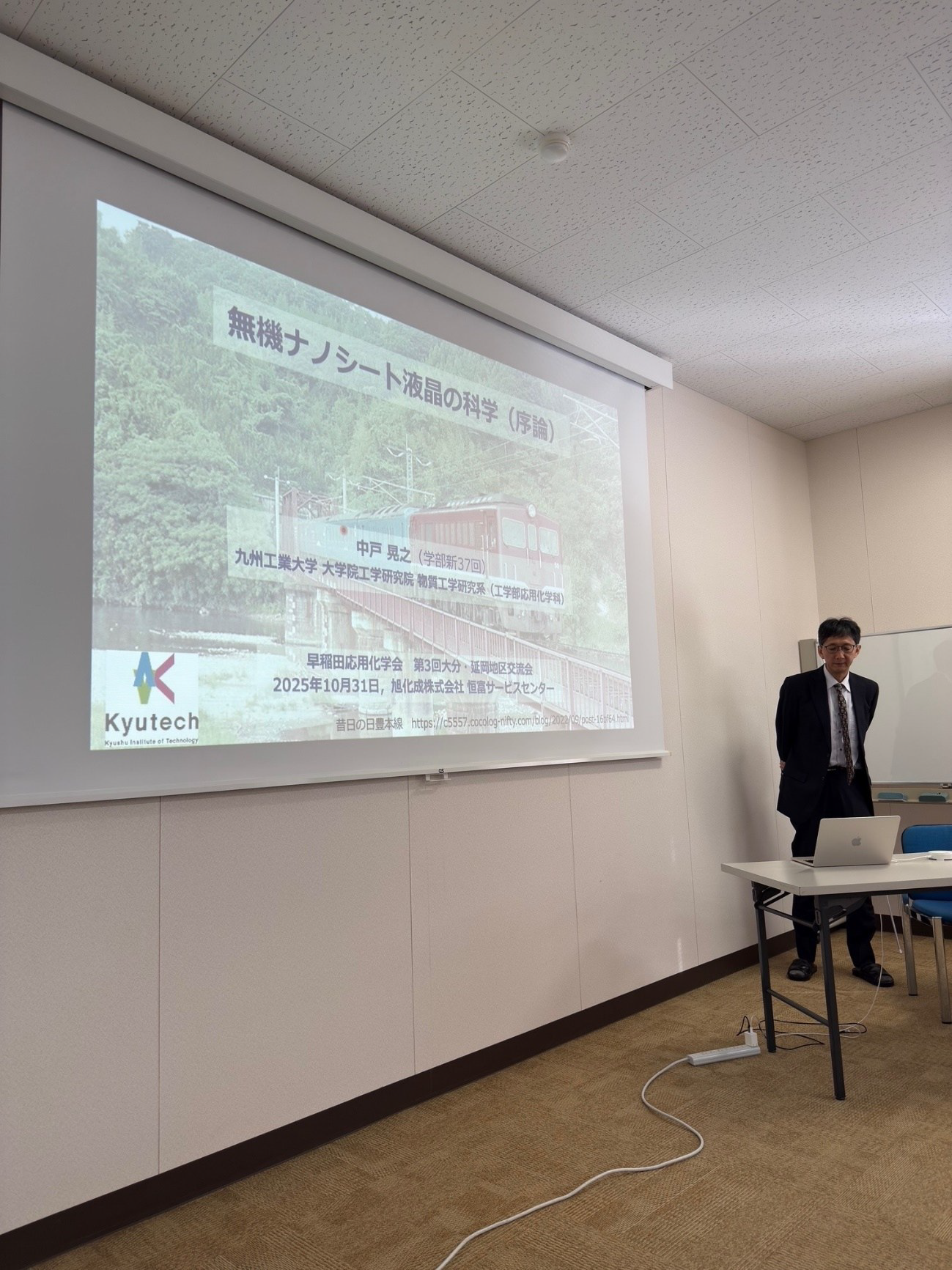 講演パートでは、九州工業大学工学 中戸先生の豊富な研究歴から現在取り組まれている無機ナノシートの最先端研究、さらに教育に関する考え方まで、幅広いテーマについてお話しいただきました。参加者は、中戸先生が進められている興味深い研究内容から新たな視点を得る貴重な機会となり、また日々の業務に活かせる多くの示唆や教訓を学ぶことができる非常に有意義な時間となりました。特に、先生からご紹介頂いた「記号接地」という概念が話題に。これは、抽象的な知識を現場での具体的な経験に結びつけることで、学びを定着させる考え方です。マネジメント経験者からは「現場での実践を伴わない教育は意味をなさない」という共感の声が多く寄せられ、今後の育成方針に示唆を与える議論となりました(気になる方は 今井むつみ著「学力喪失」 でご検索ください)。