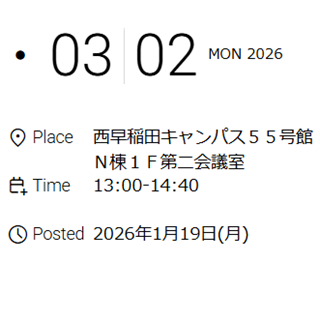 1. 開催日時: 2025年11月29日(土)15:30~17:00 2. 開催場所: ウインクあいち 1309号室 3. 出席者: 20名(オンラインでの出席者を含む) 4. 演者: 細川 誠二郎 准教授 5. […]